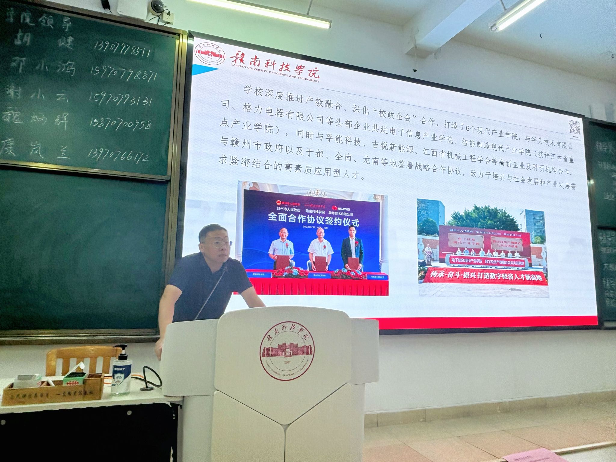学院党委副书记邓小鸿从学校发展历史、整体情况,学院文化、师资队伍、主要业绩等方面对校史院情进行了详细介绍,让新生家长对学校和学院都有了更为深入地了解。现教中心副主任谢小云则以“传承·奋斗·振兴 打造数字经济人才高地”为题,介绍了华为电子信息现代产业学院的运行模式、运行情况及人才培养目标。辅导员刘天扬代表全体班主任、辅导员表态,将努力当好大学生成长成才的人生导师和健康生活的知心朋友,陪伴学生成长、助力学生努力成才,请家长放心。