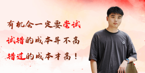 最后,他想用他的经历告诫学弟学妹们:想变得优秀其实并不难,关键在于你是否愿意迈出第一步。试错的成本并不可怕,真正可怕的是错过成长和机遇。作为转专业生的他,通过不断尝试和学习,已经证明了这一点。不要害怕犯错,因为每一次失败都是迈向成功的一步。我们要把失败看做我们成长路上的催化剂,只有勇敢地去面对失败,才能不断地超越自我,不断地向前进步。所以,各位,请鼓起勇气,大胆去追求你们的梦想吧!