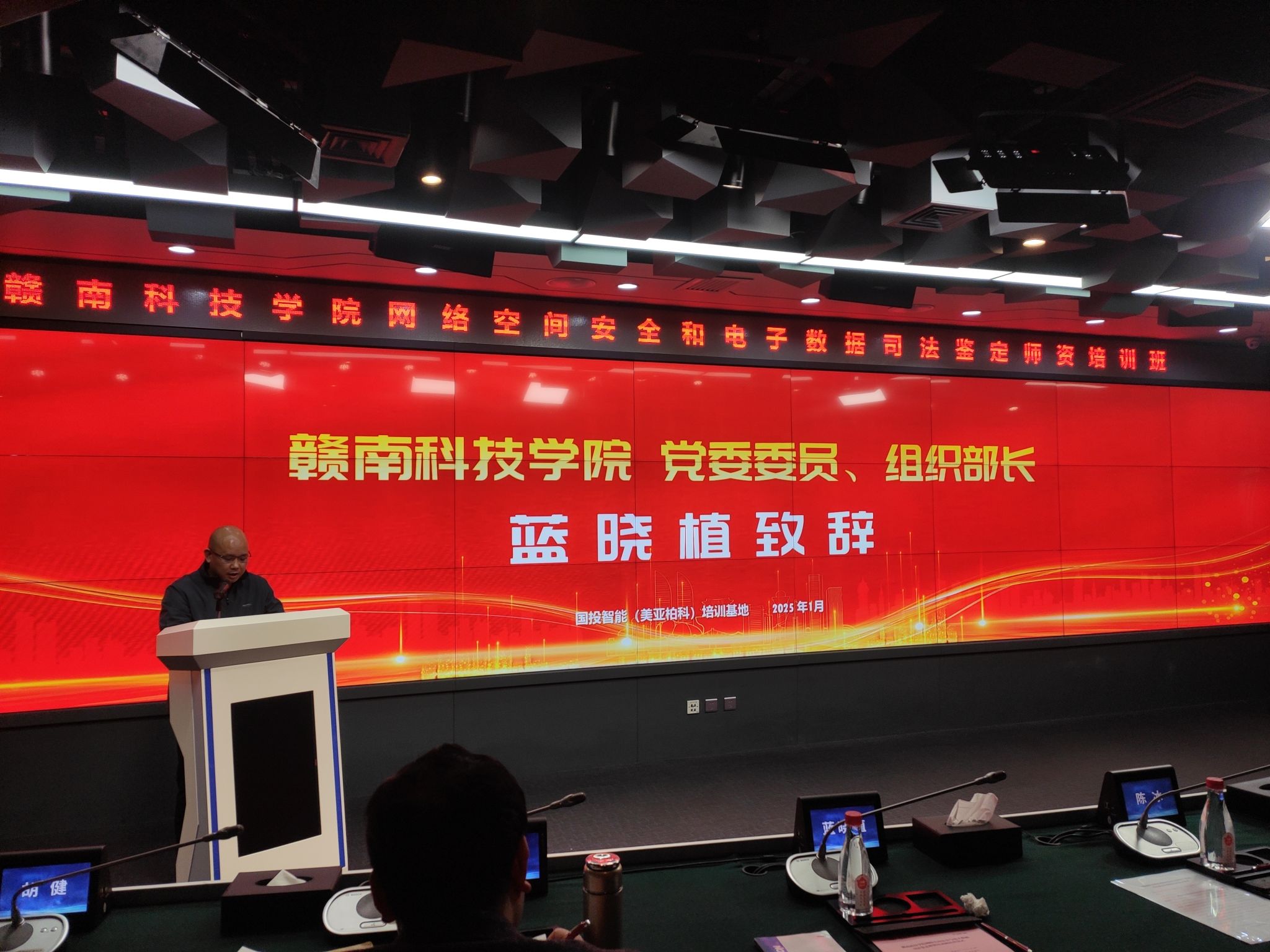 学校组织部部长蓝晓植致辞,对结业学员表示祝贺,对国投智能的支持与合作表示感谢。他指出,国投智能作为行业领军企业,与学校共同探索了诸多创新举措,此次培训班课程丰富多元,通过理论讲授与实践操作紧密结合的方式,让学员们深入掌握专业知识。蓝部长特别提到双方在电子数据司法鉴定领域的合作探索,致力于打造“政校企”合作的创新模式,推动赣州司法鉴定中心建设。他希望学员们将所学知识运用到实际工作中,为网络空间安全等领域贡献力量,并期待国投智能(美亚柏科)与学校继续深化合作。