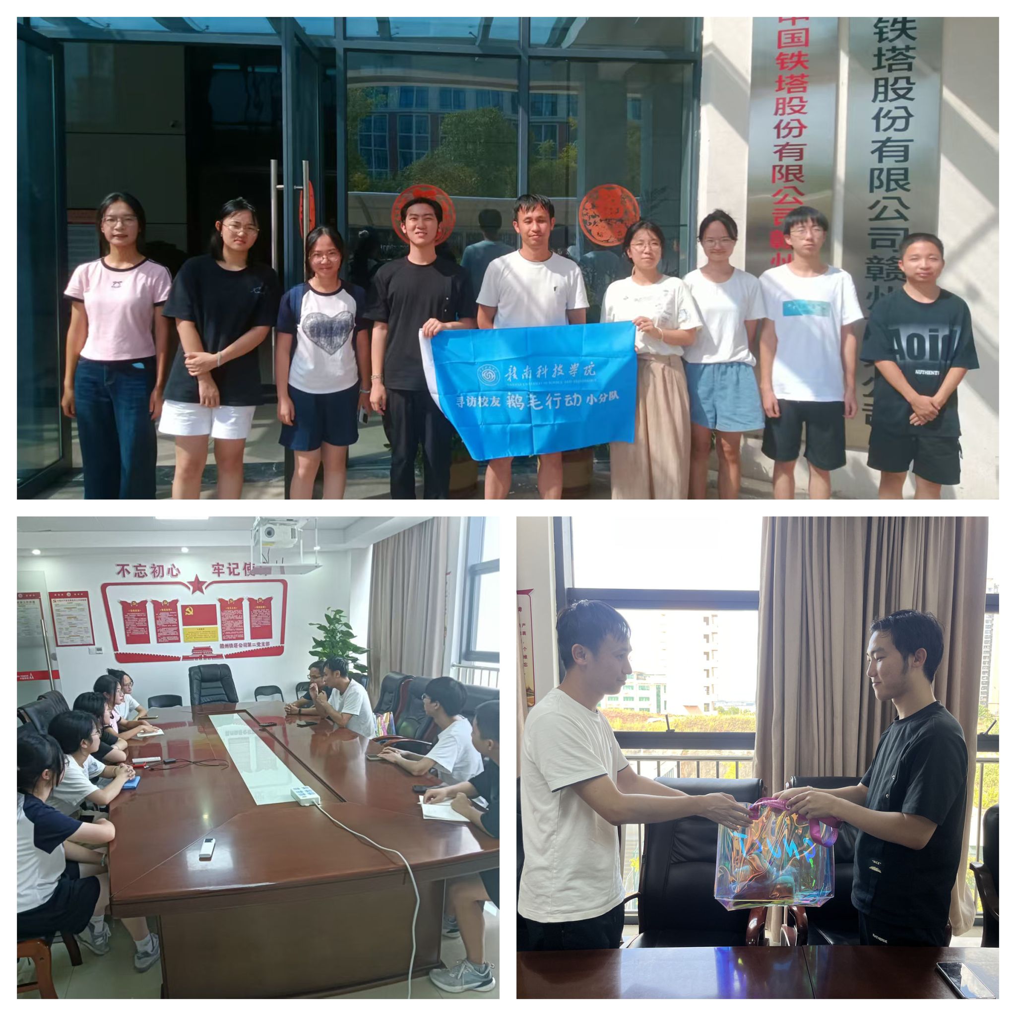 8月25日,寻访团队前往江西省赣州市经开区,采访了今年会2011届通信工程专业1班校友——中国铁塔股份有限公司赣州市分公司总经理陈小龙。活动伊始,志愿者们与校友在公司大门口合影留念,随后进入办公室和会议室赠送纪念礼品,并展开了亲切交流。陈小龙校友回顾了在校求学的时光,分享了在工作岗位上的奋斗经历和管理经验,勉励同学们要珍惜学习机会,注重专业能力的积累,提升综合素养。