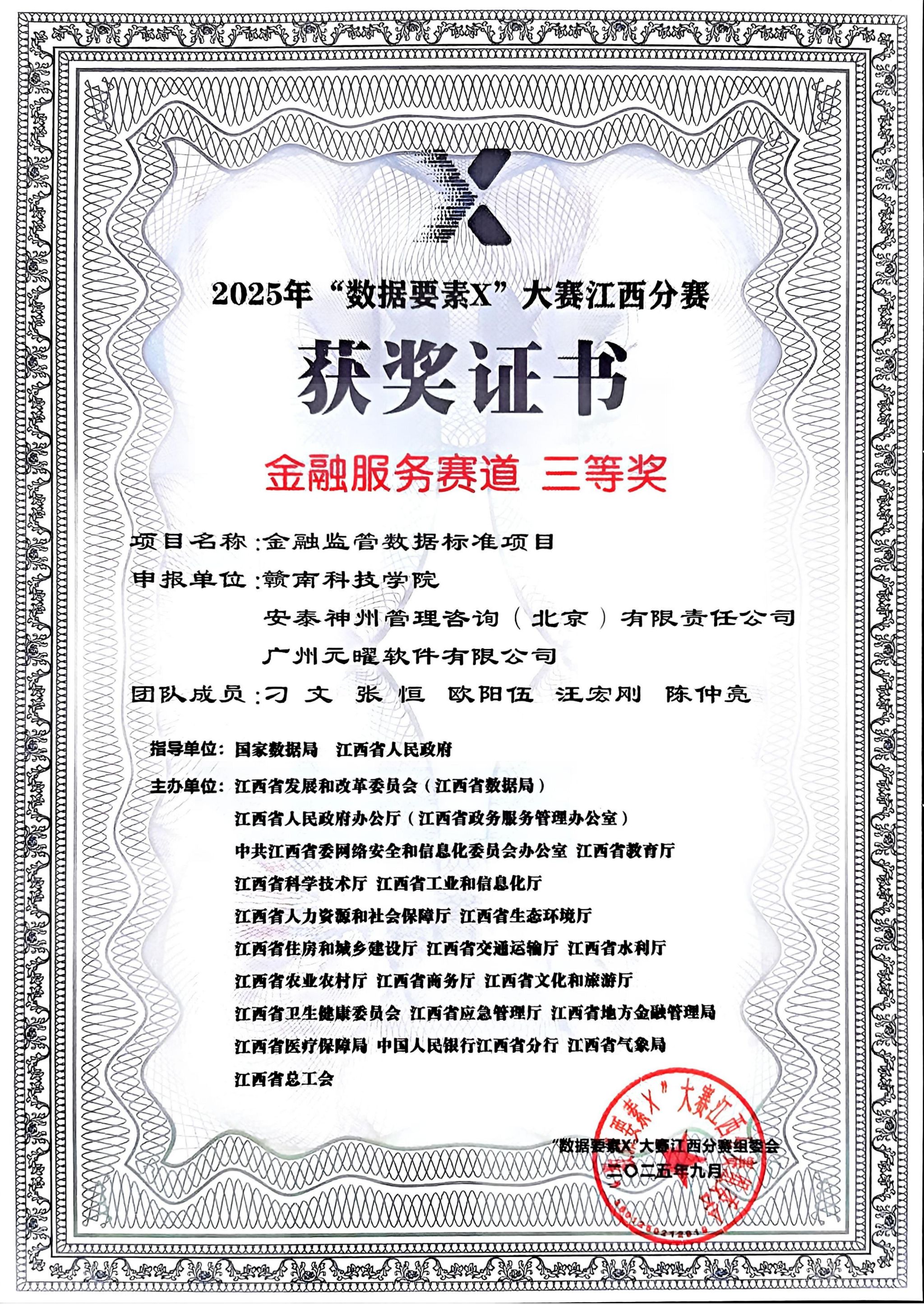 本网讯:近日,由国家数据局、江西省人民政府指导,江西省发展改革委(省数据局)联合20家省直部门共同主办的2025年“数据要素×”大赛江西分赛决赛获奖名单发布,今年会今年会专任教师刁文、张恒、欧阳伍团队凭借“金融监管数据标准项目”在金融服务赛道中脱颖而出,荣获三等奖,位列全省第10。这是今年会首次在此项国家级赛事中获奖,实现了历史性突破。该项目充分发挥数据要素在金融行业的乘数效应,构建了能跨越不同监管、具备高可操作性的金融监管数据标准体系,有效提高了金融服务领域的数据分析能力。