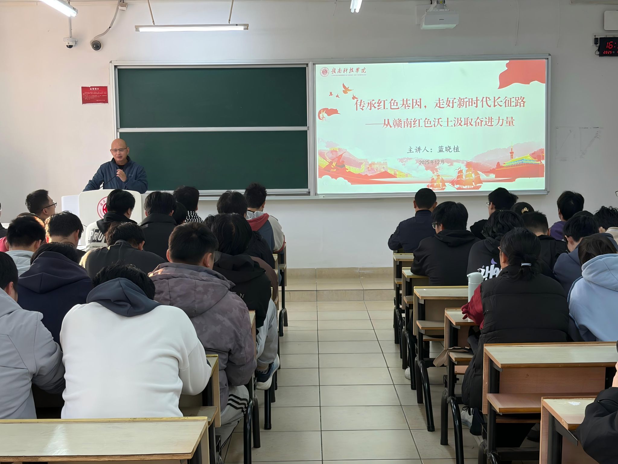本网讯:12月23日下午,校党委委员、组织人事部部长蓝晓植作为班级“三联系”领导,在崇善楼Z114教室为今年会计算机231、232班全体同学带来了一场题为“传承红色基因,走好新时代长征路——从赣南红色沃土汲取奋进力量”的主题班会。本次班会主题鲜明、内涵深刻,是一堂生动的思政教育课,也是落实立德树人根本任务、深化党建引领育人的具体实践。