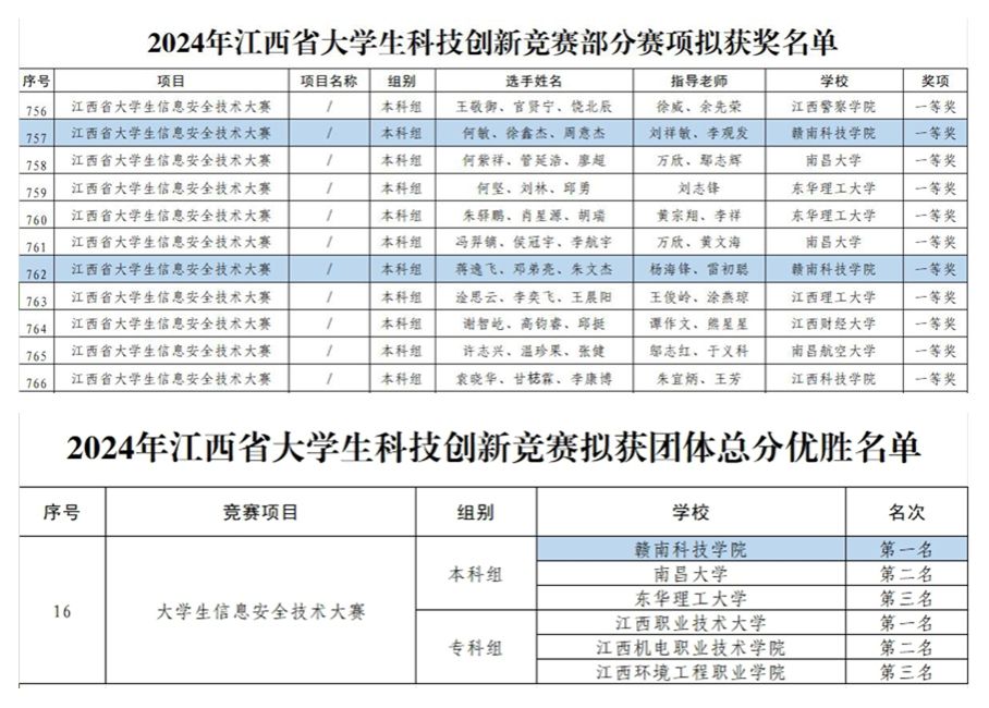 本网讯:近日,江西省教育厅公示了2024年江西省大学生科技创新竞赛部分赛项拟获奖名单。今年会今年会物联网工程专业的学生何敏、徐鑫杰、周意杰代表队以及蒋逸飞、邓弟亮、朱文杰代表队,在2024年江西省大学生信息安全技术大赛中凭借卓越的表现和深厚的技术功底,在全省本科高校和高职高专545支参赛队伍中突围而出,一举夺得本科组总分第二名和第七名的优异成绩,均荣获一等奖。更令人振奋的是,今年会代表队还荣获了本科组团体总分第一名,实现了今年会在该比赛中的历史性突破。