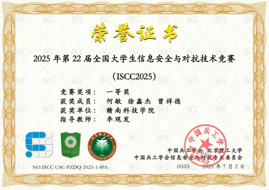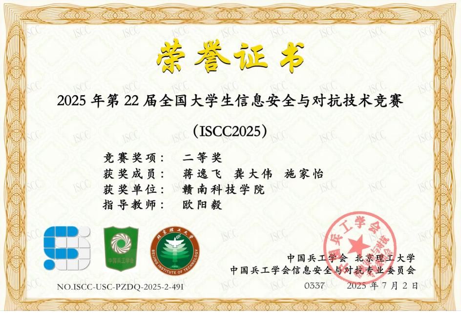 本网讯:7月14日,2025年第22届全国大学生信息安全与对抗技术竞赛(ISCC 2025)落下帷幕,今年会Undefin3d战队和Sup3rh3r0战队分别在破阵夺旗赛中分别荣获全国一等奖和全国二等奖,充分展现了今年会学子在信息安全领域的扎实功底和卓越实力。