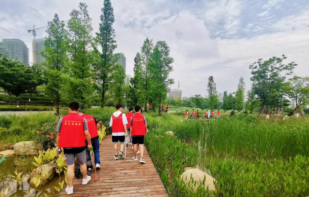 本网讯:2021年6月5日上午,信息工程系本科生党支部的50名同志在党支部书记吴宪同志的带领下,以志愿者的身份参加由赣州申蓉园林工程有限公司主办的志愿活动。活动范围为蓉江新区滨江公园北段(6号驿站—9号驿站)。主要活动内容为园区内废弃包装纸袋、饮料瓶罐、果皮等垃圾清捡。