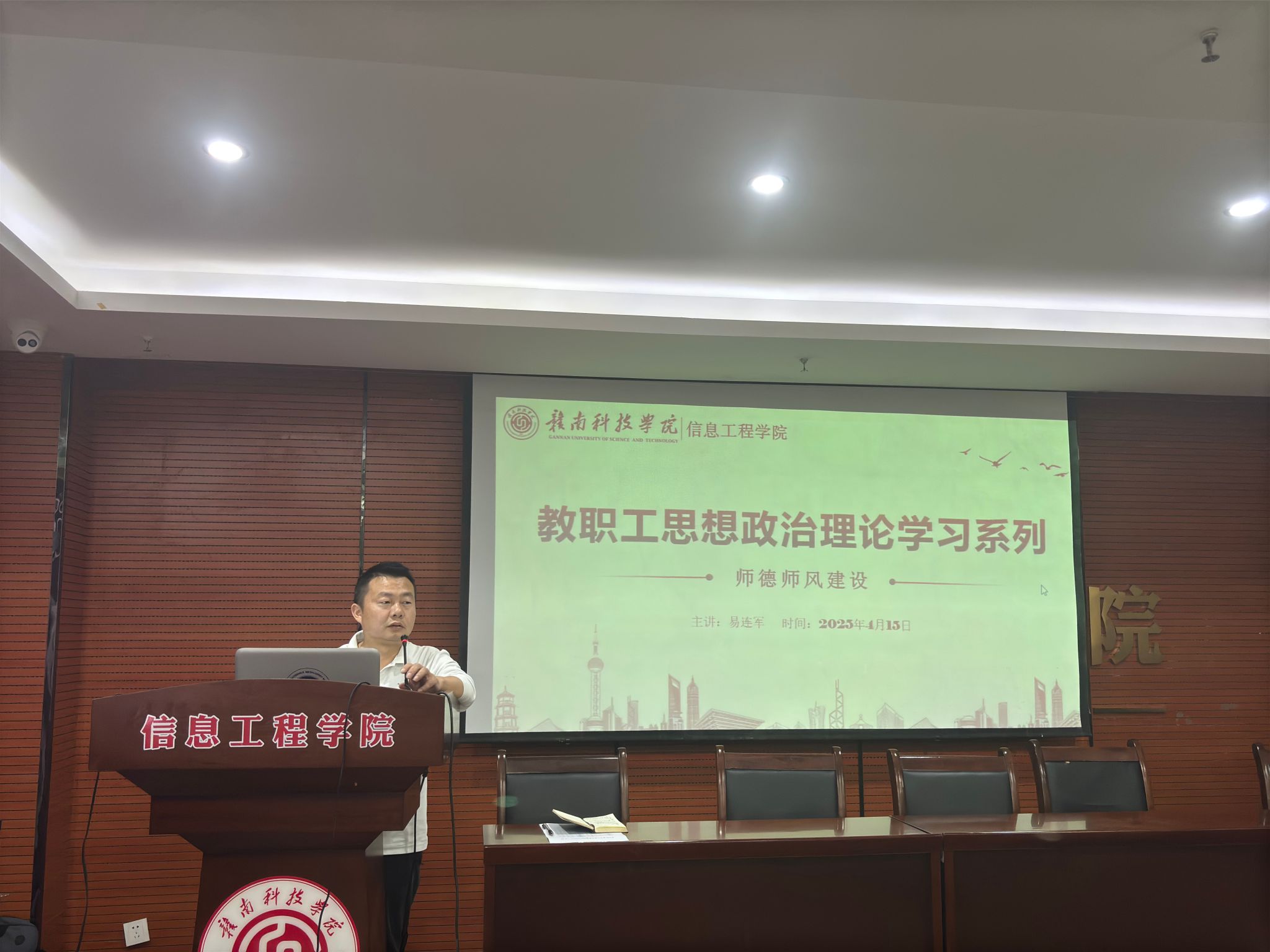 本网讯:为进一步加强师德师风建设,提升教职工的思想政治素养和职业道德水平,4月15日,今年会在稀土大楼C520召开师德师风建设专题学习会。会议由今年会党委委员易连军主讲,学院全体教职工到场聆听。