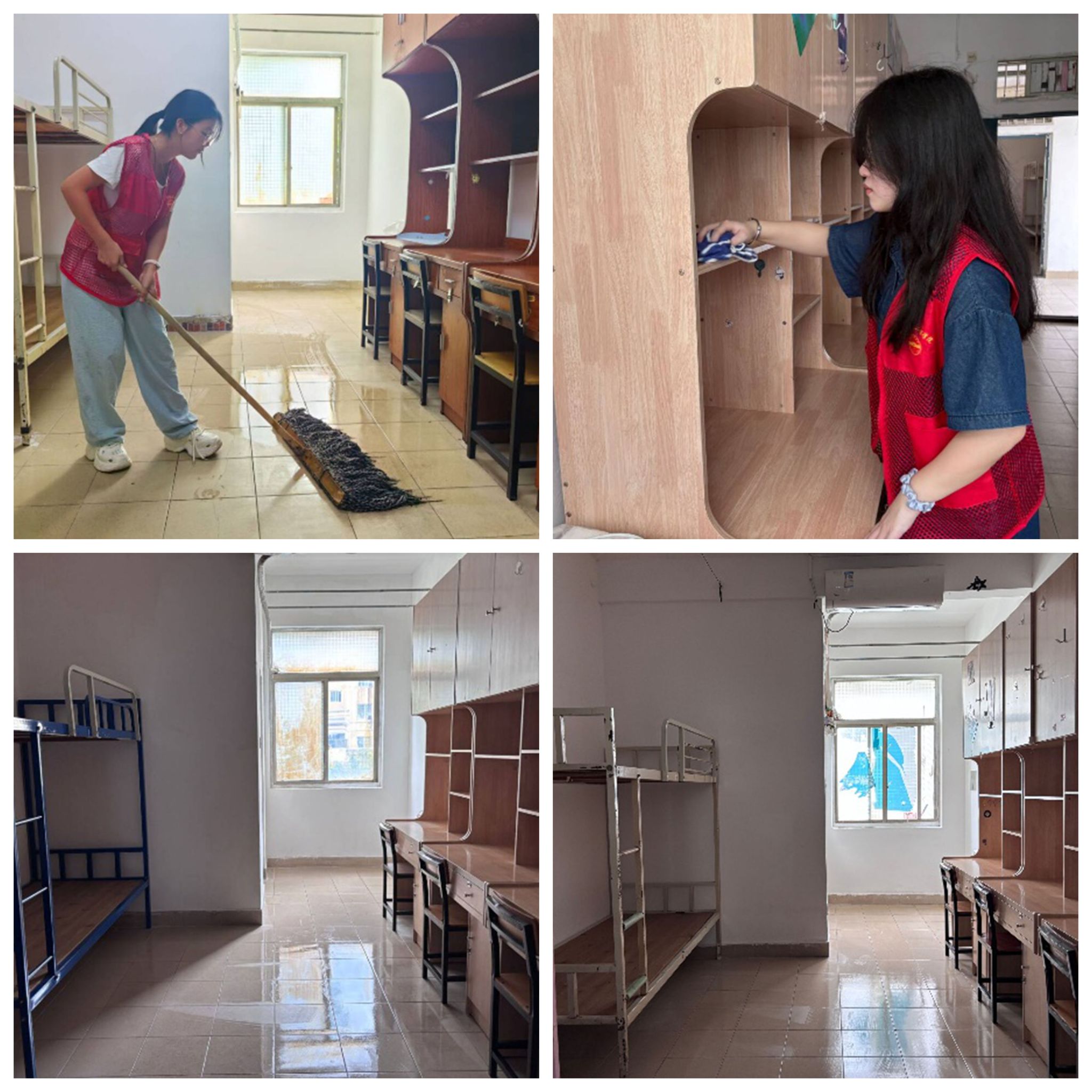 当天虽然高温持续,但志愿者们始终情绪饱满、积极投入。大家分组协作、互相配合,对每一间宿舍进行了全面整理与打扫,从擦洗桌椅、清理门窗,到检查设施、通风除尘,每一个环节都认真细致、高效推进。经过一个多小时的集中清扫,新生寝室变得干净明亮、整齐有序,整体环境焕然一新。为即将入住的2025级新生创造了干净舒适的生活环境。
