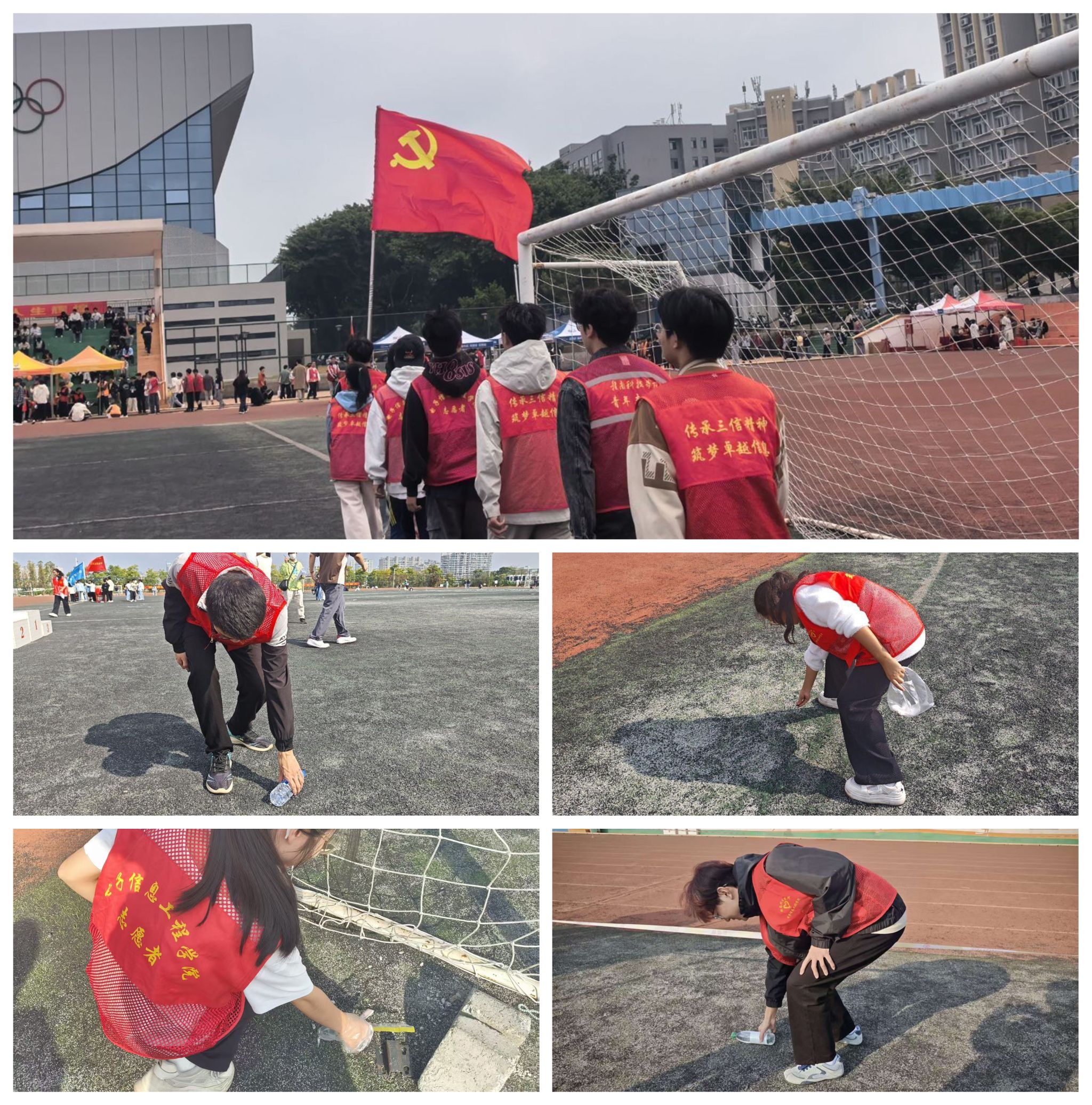 本网讯:10月31日至11月1日,学校第二十三届运动会盛大启幕,赛道上的冲刺点燃全场欢呼,领奖台的荣光闪耀晴空。而在这些热血瞬间之外,信息学院学生支部党员先锋示范岗的志愿者们,以一抹“志愿红”生动诠释了“团结友爱、追求卓越、忠诚担当”的“三信精神”。他们身穿红马甲、手持垃圾袋,穿梭在看台缝隙与跑道边缘,将散落的纸屑、空瓶一一拾起,用指尖的细致守护赛场的洁净,让“红色力量”成为盛会中最温暖的底色。
