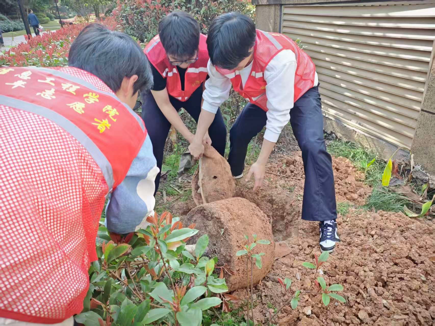 随后,志愿者们跟随社区工作人员正式开展志愿服务活动。大家手持工具,来到社区绿化区域分工协作,扶苗、培土、浇水,每一个步骤都认真细致。大家齐心协力种下一棵棵树苗,用汗水为社区增添绿意,用实际行动守护生态环境,让城市家园变得更加清新美好。