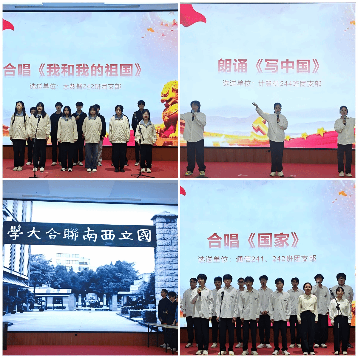 活动伊始,大数据242班团支部用一首深情的《我和我的祖国》唱出了对祖国深深的爱意;通信241、242班团支部紧接着唱响《国家》,表达了青年学子对国家的无限热爱和对未来美好生活的向往。话剧《西安事变》带领观众回到了那个决定中国命运的历史时刻,而计算机243班团支部带来的《如愿》则以动人的旋律诉说着对和平年代幸福生活的珍惜。此外,计算机244班通过朗诵《写中国》,展现了中国悠久的历史文化与发展成就。《战火中的大学生》与《火柴》两部话剧,生动再现了抗战时期大学生们不屈不挠的精神面貌以及普通民众在战争中坚守希望的故事。