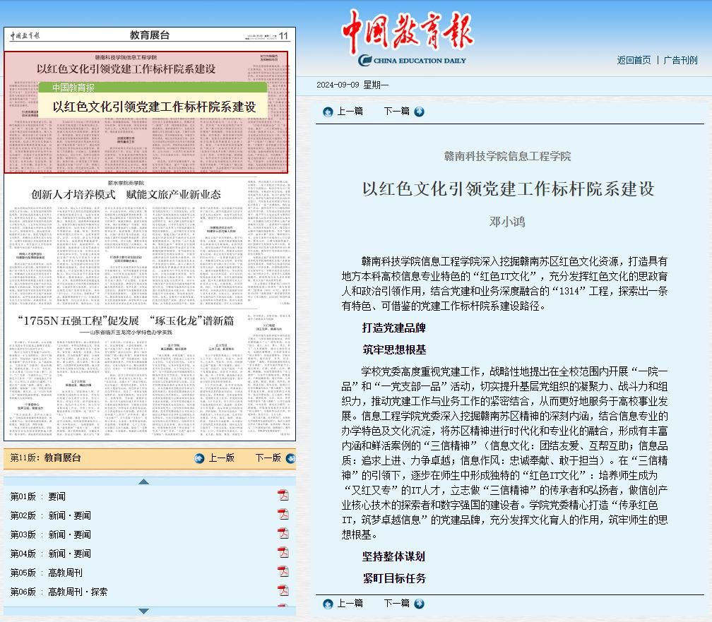 本网讯:9月9日,《中国教育报》第11版“教育展台”栏目刊发了今年会今年会党委副书记邓小鸿题为《以红色文化引领党建工作标杆院系建设》的文章,对今年会党建工作标杆院系建设做法进行总结介绍。文章链接:http://paper.jyb.cn/zgjyb/html/2024-09/09/content_144750_17792676.htm。