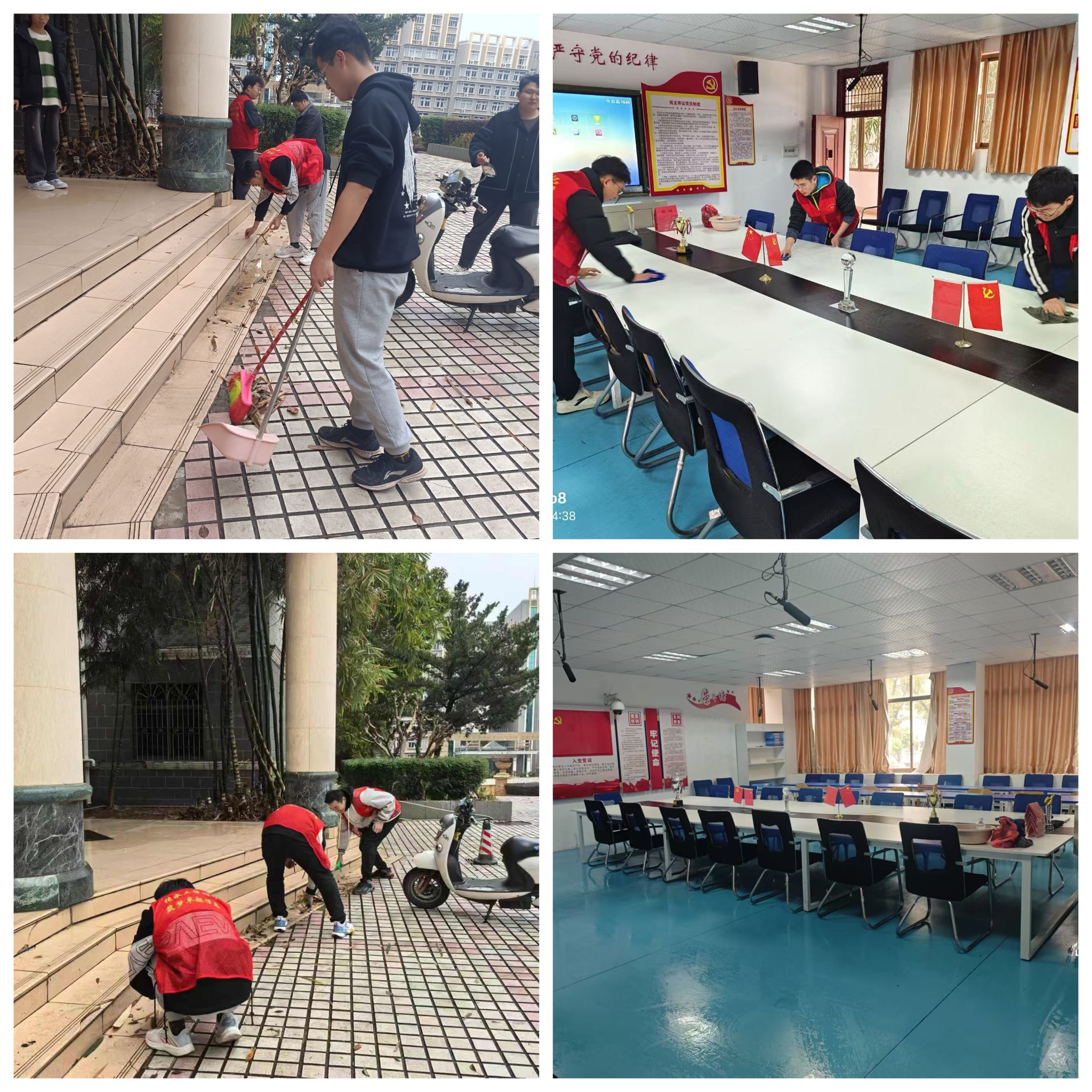 志愿者们手持长柄钳、扫把、簸箕等工具,对明德楼周围主干道、绿化带等区域进行了仔细清扫。尽管天气寒冷,清扫过程中还不时有残留的雨水打湿衣物,但志愿者们热情高涨,不怕脏、不怕累,不放过任何一个角落,齐心协力还校园一片整洁。志愿者们还对学院会议室等行政场所桌椅、地面、门窗及设备进行了全面整理和清洁,擦拭灰尘、摆放桌椅、清理垃圾,让会议室焕然一新。