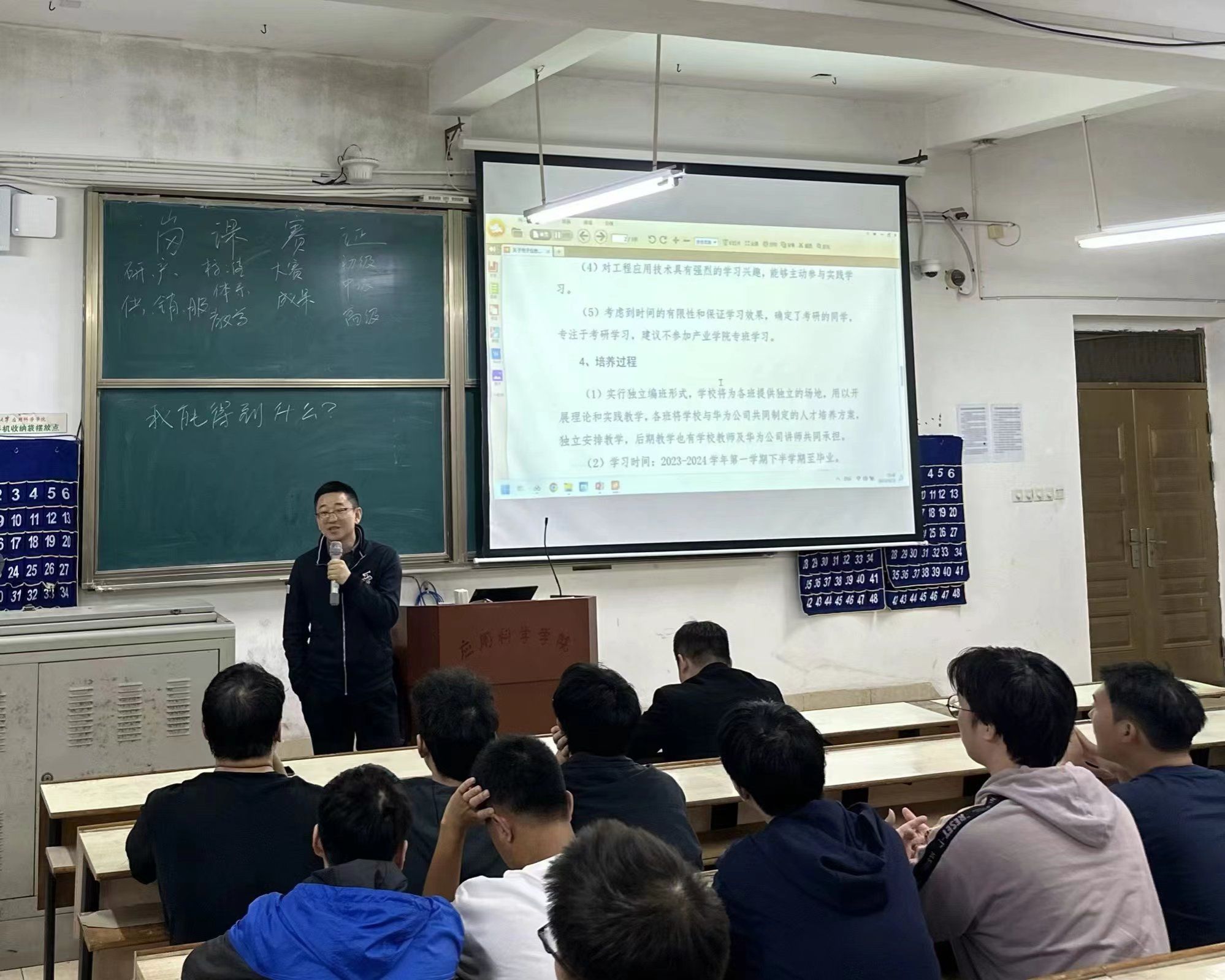 汪尧则围绕“岗”“课”“赛”“证”四方面向同学们讲述“加入产业学院,你能获得什么?”,他指出,产业学院将探索“岗课赛证”四位一体育人模式,以“岗”为目标,打通“赛证课”融合模式,将学科竞赛、专业证书知识点和技能点融入课程教学内容,构建层级递进的课程体系,实现复合型人才培养目标,提升学生就业创业竞争力。