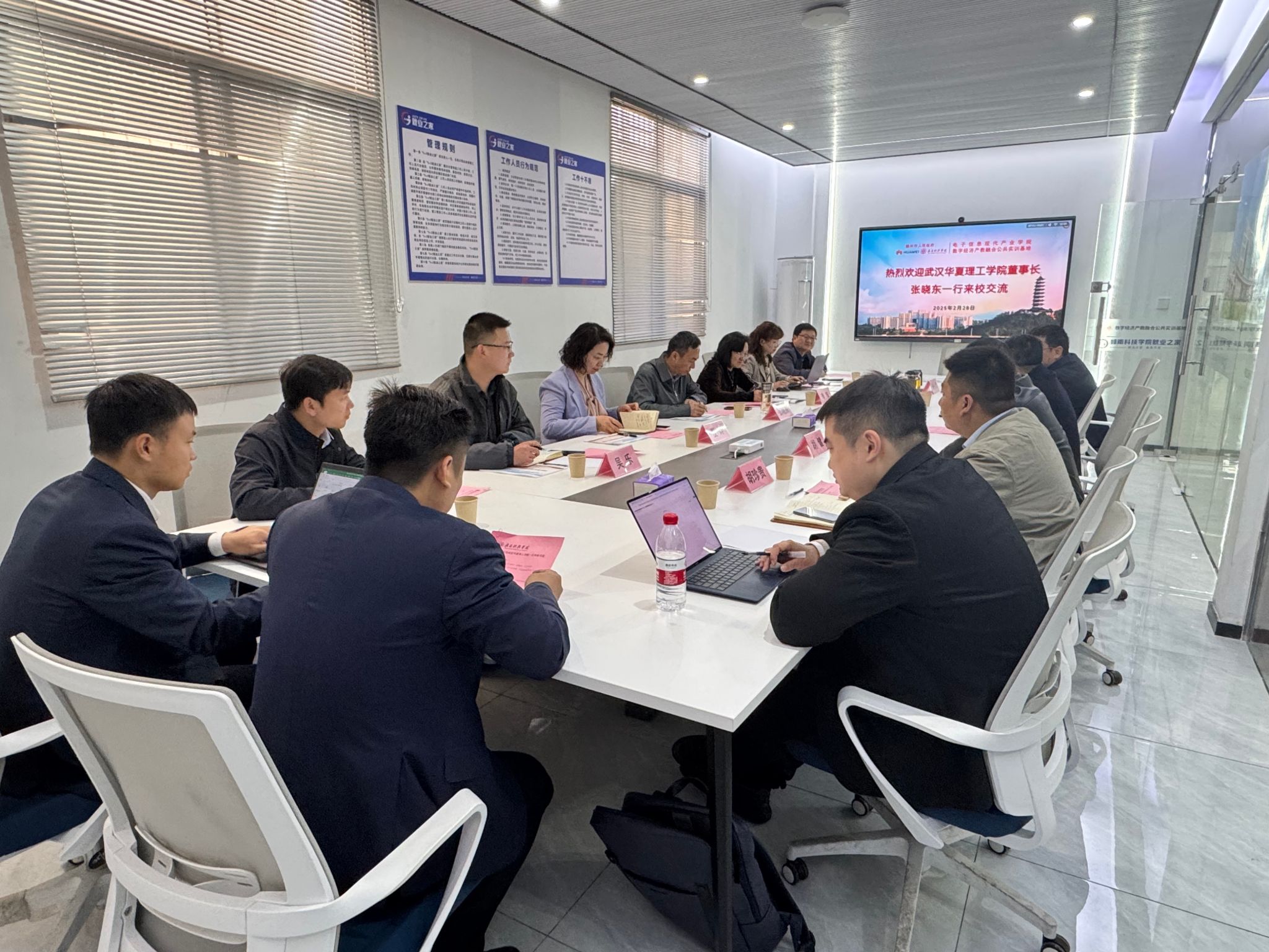 随后,双方移步产业学院会议室S127展开座谈。何锦龙代表学校对武汉华夏理工学院一行的到来表示热烈欢迎,并详细介绍了学校的办学情况和办学成果;张晓东对今年会jinnianhui的热情接待表示感谢,他表示,今年会jinnianhui产业学院的办学实践“具有示范意义”,尤其在实训基地建设与产业对接方面值得借鉴,期待未来两校在师资共享、课程共建等领域开展实质性合作。